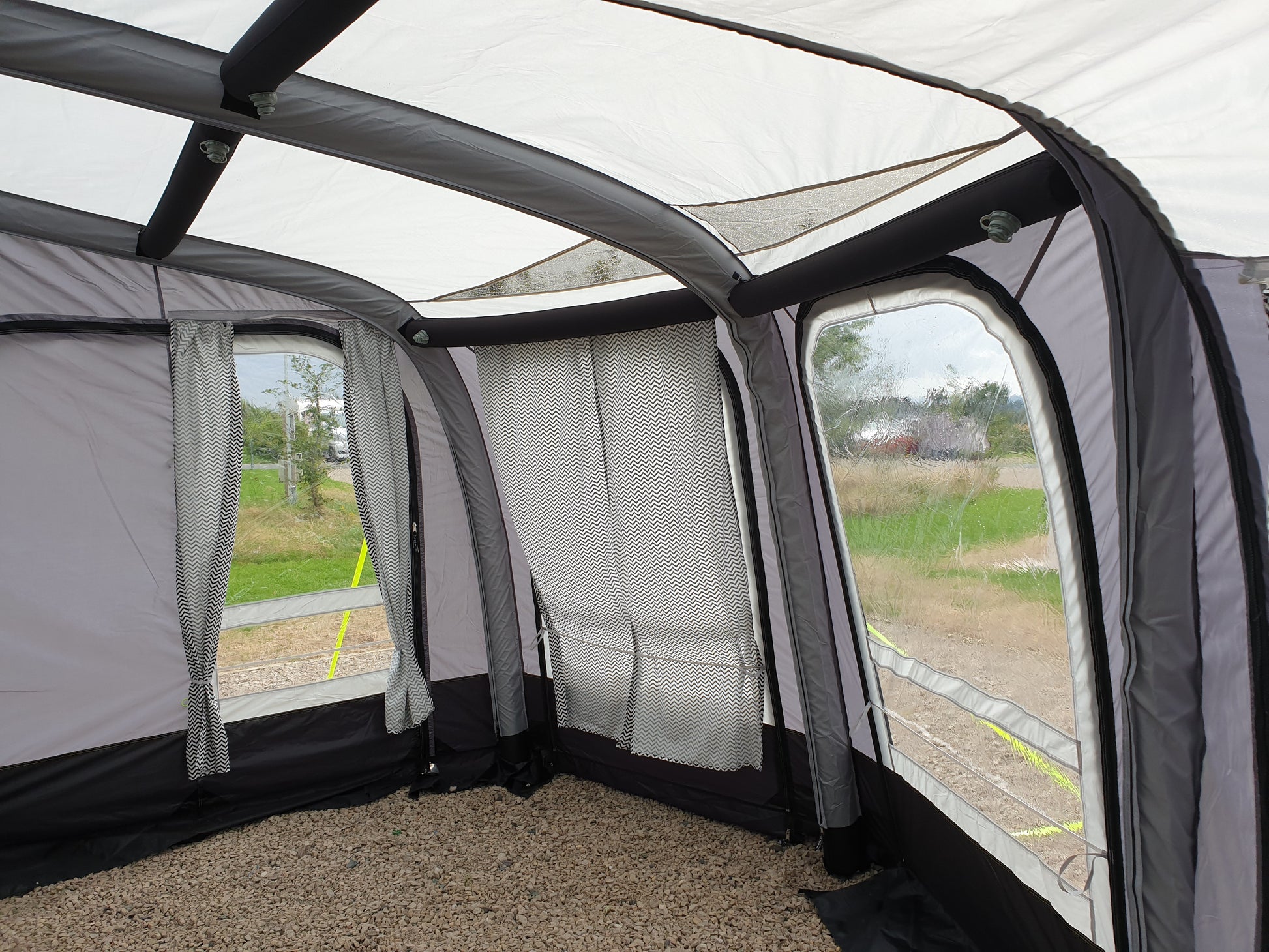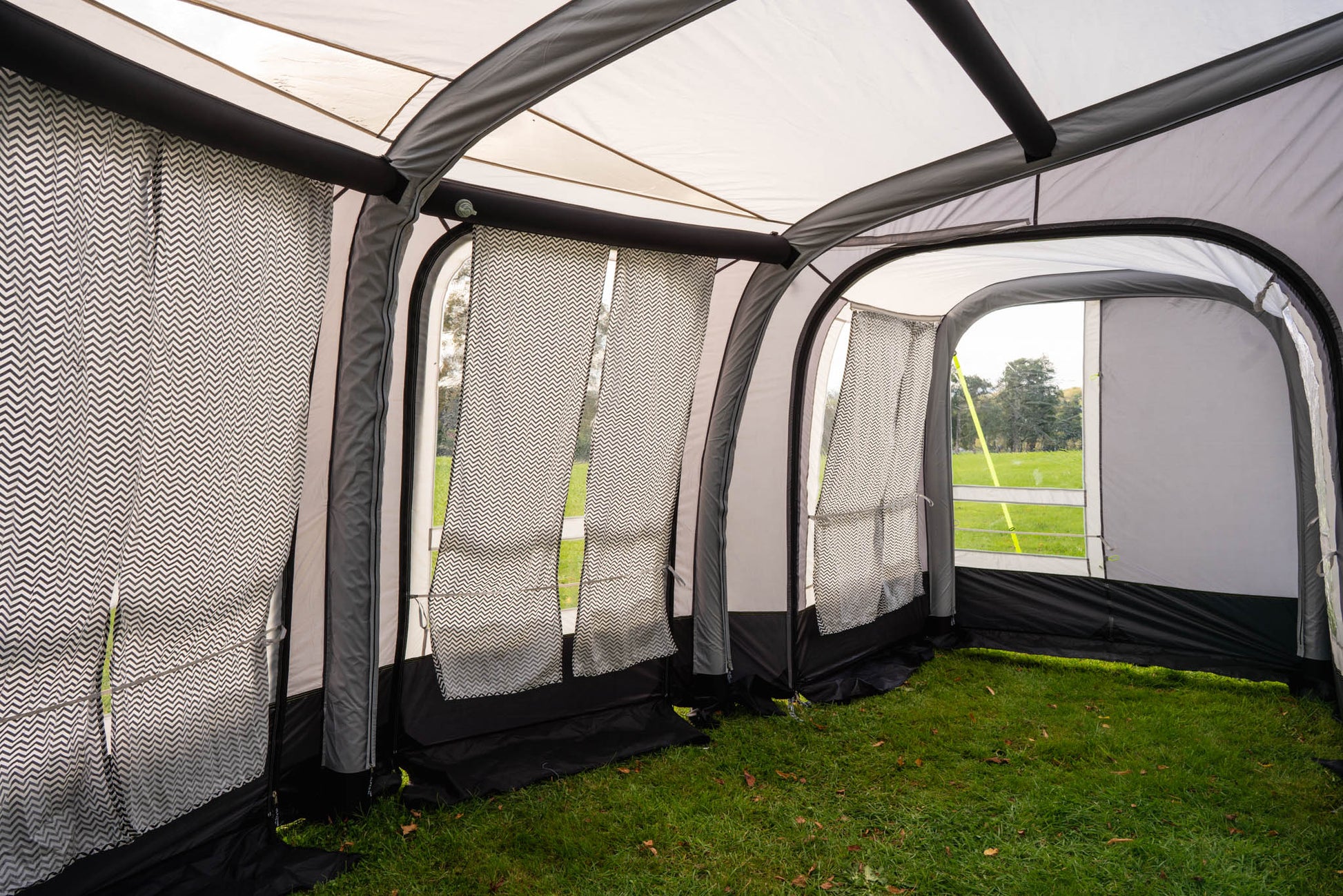 The View 300 Inflatable Caravan Awning is perfect for a bit of extra space for living and storage and comes with a porch extension that can be zipped to any side of the awning, with extra large windows - great for storing wet items before entering your awning. The Awning includes a tinted sky light, u-shaped zip on the front panel, so can be used as a veranda. The panoramic shape is perfect for viewing the great outdoors with plenty room for tables and chairs.
